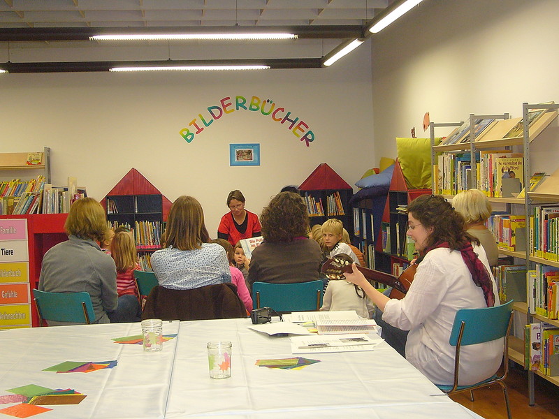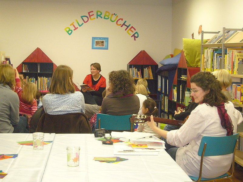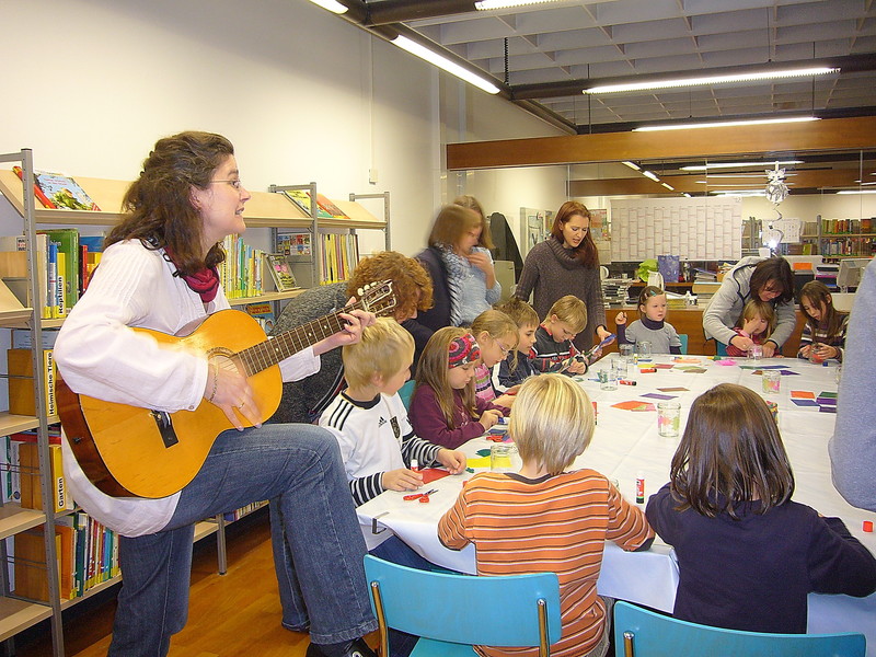 Frau Haltrich und ihre Gitarre geleiten die Zuhörer durch die Geschichte, zwischendurch singen alle zusammen Weihnachtslieder zur Einstimmung auf...