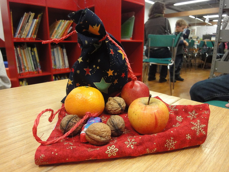Fleißige Fördervereins-Engelchen haben die Weihnachts-Säckchen liebevoll genäht und mit Äpfeln, Nüssen und Mandarinen befüllt.