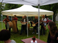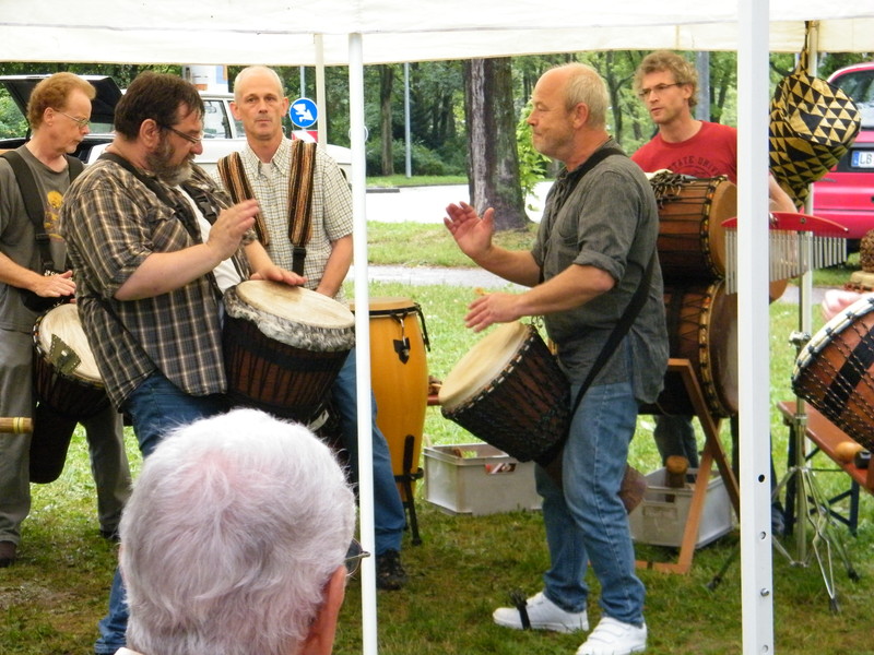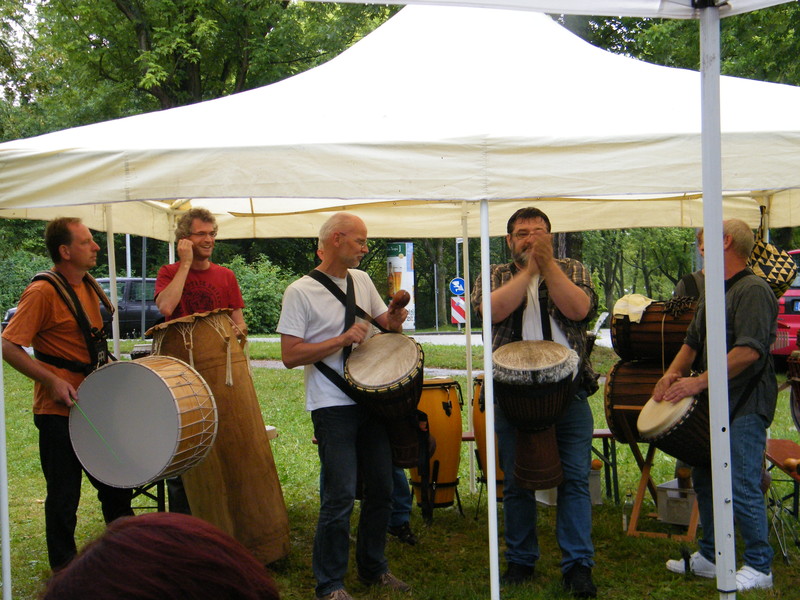 ... Die Ziegenklopfer sind zum Glück auch nicht wasserscheu und trommeln die Gäste des zweiten Bibliotheksfestes zusammen: